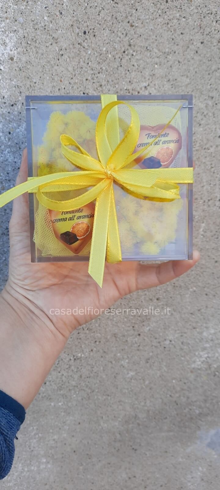 scatola di plexiglas rigido confezionato con mimosa e cioccolatino. un piccolo pensiero per conservare la mimosa ancora più a lungo. misure 10x5 cm